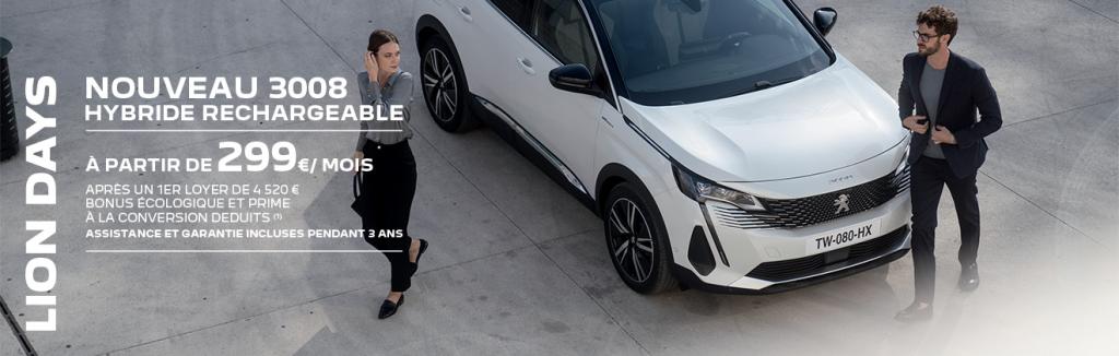 (2) Soit une reprise de 6 000€ de votre véhicule éligible à la prime à la conversion. Offre non cumulable avec l'estimation indicative de votre véhicule effectuée sur le site Reprise Peugeot. Le véhicule repris doit être d’une puissance réelle inférieure ou égale à celle du véhicule neuf acheté. Offre réservée aux particuliers, incluant la prime à la conversion en vigueur selon éligibilité, valable du 01/04/2021 au 30/04/2021 pour toute commande d’un Nouveau 3008 Hybride Rechargeable neuf, passée avant le 30/04/2021 et livrée avant le 30/06/2021 dans le réseau PEUGEOT participant. Offre non valable pour les véhicules au prix Peugeot Webstore et les véhicules sur le site store.peugeot.fr.