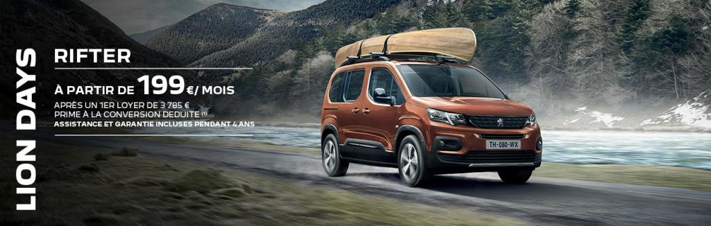 (1) Peugeot RIFTER à partir de 199 €/mois, après un premier loyer de 3 785€. Assistance et garantie inclus pendant 4 ans. En location longue durée sur 49 mois et pour 40 000 km. Exemple pour la location longue durée (LLD) d’un Peugeot RIFTER Standard Style PureTech 110 S&S BVM6 neuf, hors options, incluant l’assistance et l’extension de garantie pendant 49 mois. Montants exprimés TTC et hors prestations facultatives. Offre valable du 01/05/2021 au 31/05/2021, réservée aux personnes physiques pour un usage privé pour toute LLD d’un Peugeot RIFTER neuf dans le réseau Peugeot participant, sous réserve d’acceptation du dossier par CREDIPAR, loueur et SA au capital de 138.517.008 €, RCS Versailles n° 317 425 981, ORIAS 07004921 (www.orias.fr), 2-10 boulevard de l’Europe 78300 Poissy. Offre non valable pour les véhicules au prix Peugeot Webstore et les véhicules sur le site store.peugeot.fr. Le Contrat de Service Pack Extension peut être souscrit indépendamment de toute LLD aux conditions disponibles dans le réseau Peugeot participant.